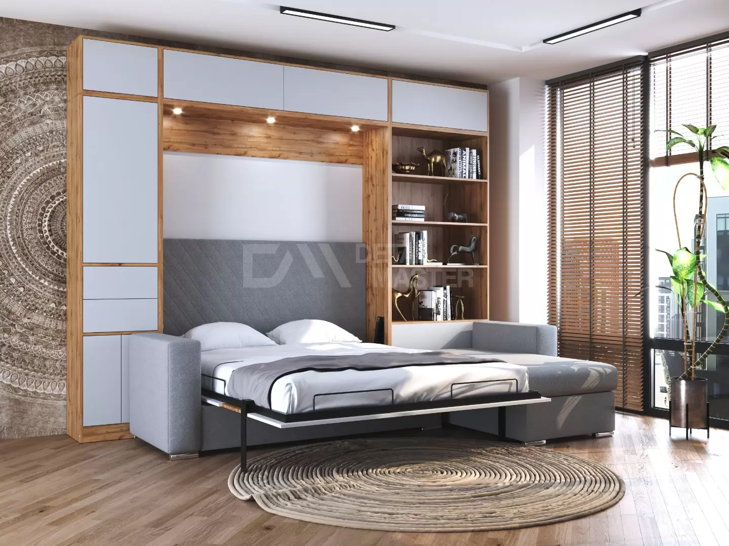 Шкаф-кровать трансформер с диваном "Big Family Balance"работает на механизме раскладывания собственной разработки "Balance". Кровать раскладывается легким движением руки, превращаясь в полноценное спальное место. Просто потяните за ножку-маятник, которая самостоятельно фиксируется в нужное положение при опускании.